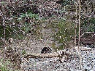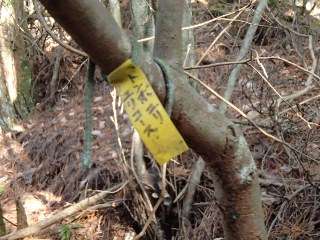 いつもの北滝橋のたもとの小広くなった路肩に稲妻号をデポし、準備にとりかかる。8時少し前に出発できた。 橋の脇から(塩化カルシウムの置き場がある方)入っていくのだが、前ならジャブジャブと川を渡っていけたものが、大水のせいで岸が崩れて高くなっていて、向こう岸の植林地にあがれないから、斜面を高巻いて行かなければならない。ところが今年の初めより踏み跡が鮮明になっていて、林業の人が通ったか?団体さんが歩いたか?