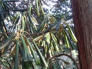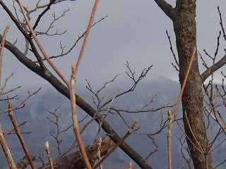 堰堤の向こう側、一度川を渡るポイントも、鹿の通り道ができていて簡単に渡れるようになっていた。正面の尾根に取り付く。地形図には破線の道が谷に沿ってあるが、もはや痕跡は無いように見える。20mほど登ると、トンボユリのユリコースと北尾根コースの分岐。okaokaさんの標識が健在だった。 尾根コースに取り付く。コースと言っても踏み跡は無い。古道跡なのか雨水の通り道なのか、掘れたところはあるが、落ち葉がたまり歩きにくいので、あまり気にせず、適当に登って行く。 今の時期、衣服調整が難しい。体が寒さに慣れておらず、厚着がちになるが、動けば汗をかき、風が吹けばちぢみあがり。とにかくも汗をかかない程度、息を切らさない程度で登ることを心がける。 あまり風は無いが、朝日に照らされた落雪なのか何なのか、ダイヤモンドダストのように樹幹でキラキラと光るものがあり、写真に撮るがうまく写らない。この尾根のシャクナゲにも来年の花芽は全く無く、どこの山とも同じ。寒そうに葉っぱを丸めにかかっている。