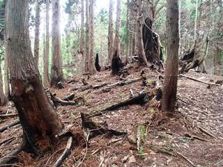 情報によると、例の美山トレイルの連中は、赤崎中尾根を降りたとのことだったが、中尾根の方向にテープ付けの様子はないので、安堵する。ただ、中尾根の方向に踏み跡が鮮明になってきているのは困りもの。一応、ここは立ち入り禁止区域である。立ち入りには京大フィールドセンターの許可がいります。 ラーメンタイムを終え、下山ルートを考える。聞けばJOEさんは、いつも登山道を踏み外すことなく、まっとうなルートを歩かれているので、首吊り尾根など歩いたことが無いとおっしゃる。逆に小てつは、ここらあたりのルートでは、ある事情からまっとうなルートを歩かされたことの方が少ないくらいなので、それではと首吊り尾根で降りることとする。 首吊り尾根の取り付きは、雷杉の先の細尾根になったところを降るのであるが、前にokaokaさん達が、ここから降りる目印に、毛糸にビニールテープをつけた特徴のあるやり方で、「首吊り」とだけ書いてあったものが、いくつか取り付きに落ちていて、「首吊り」「首吊り」と、知らない人には意味不明だったことを思い出し、笑う。 さて降りてみるのだが、以前からはじめは尾根なのか、ただの斜面なのかわからないくらいで、少し降りれば踏み跡も現れ、ルートも鮮明になっていたはずが、前にJOEさんと御一緒した四郎五郎峠の尾根バリに、ヤブになっていて進路が不鮮明になっている。ここを歩きたければ、一度下から登ってみるなどの方がいい。初心者は全くヤバいルートになってしまった。 それでも超特急ルートであることは間違いなく、いつも広河原から、今日とは逆のルート取りで歩かれていたJOEさんにとっては、登りの時短ルートに最適であると言うことだった。 降り立ったホラノ谷の林道終点の景色も、以前とは違う様子で、新しい対岸の林道もできていた。早稲谷よりも崩れのマシなネジリキ谷を歩き、2時に広河原に到着。帰りの支度を整えて、喫茶店に寄り道。
