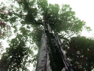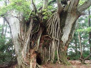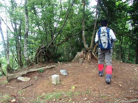 ピークでは心地よい風が吹き、真夏とは思えないくらいの涼しさで、いつまでもいたいくらい。しかし、いつまでもいることもできないので、西向きの稜線を進んで行く。 曇天ではあるが、付近の山々の稜線はクッキリ見えている。起伏の少ない稜線をどんどん進めば、バイケイソウのある鞍部に到着する。とは言っても、バイケイソウは最近クサギの進出に攻め込まれてめっきりと減ってしまった。それでも毎年咲いたところを見たことがなかったのに、今年はいくらか咲いたようで、実をつけた株を数株見る。 P911を過ぎ、哲郎さん命名の「エイリアンの木」を過ぎればすぐにトチノキの鞍部。ここで珍しくまだ変色していないトチノキの落ち種をひらったので、おかみさんにお土産とする。鞍部に妙な看板が落ちているので見てみると、八丁の村長がここらを歩いたという記念?の看板だった。佐野さんにボコボコにされてから、このあたりには来ないんじゃなかったのか?? 急坂を登ると雷杉。雷杉は何か前より元気になったんじゃないだろうか?南のP866の風化木がすっかり枯れてしまったのに、こちらはまだまだ大丈夫。 さて雷杉までやってきてラーメンタイムとする。今日は夏向きで喉の通りがいいマルタイラーメン鳥塩佐賀県!JOEさんは、夏の定番「日清 焼きそば」。
