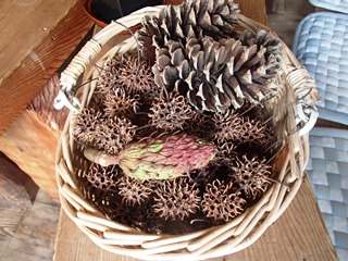 おかみさんに、お土産のトチノミと、前にひらって持ってくる機会を待っていた「モミジバフウの実」と「大きい松ぼっくり」を渡す。すぐにオブジェにと、籠もりにするおかみさん。さすがの盛り付け。 バス利用でも十分歩けるルート取りを、ママチャリまで使うなど、カッパさんが見れば笑われてしまう道中でしたが、盛夏の折にはこれも有りとしておいてください。ハハハ