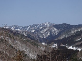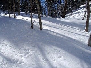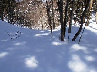 単独シューの踏み跡は、迷わず下壺口ルートを踏んでいて、ますます自身が迷わないようにつけた印とは思えなかった。おかしいと思ったのは、2年前に小てつがここを降った時にあった、ショッキングピンクのテープが全く無くなっていたことだった。 天気はますます良くなってきて、肉眼では赤坂山までわかるようになってきたと眺めていると、その奥に雲かと思ったら白山ではないかと思うシルエットが確認出来た。以前、大見影山からは見たことがあり、ここよりもう一つ北の三国峠に登った時に出会った犬連れの男性から、三国峠から白山が見えることは聞いていたが、まさか三国ヶ岳から見れるとはと感激する。でも、小てつの弱小デジカメでは、うまく写らない。ここは、おばさん山歩き隊のTさんに、本格冬山仕様も用意していただいて、また御一緒していただかなくてはならない。 去年も同時期にokaoka隊の4人でここを降ったが、間違って下壺口に降りてしまった。おととし、今年と違って、雪が少なかったため、下壺口の山道が途中で見えたため、それをたどってしまったからだ。今年は雪がたっぷりとあるため、忠実に尾根だけたどり時計で標高を確かめながらP686あたりになると方向を注意して北東に向くように意識しだす。 単独シューは下壺口に降ったようだった。我々はそれにつられず、北東に伸びる緩やかな尾根を目指す。一箇所だけ地図とは違う急な斜面があるが、30mほど奮闘すると、なだらかな尾根となる。急な斜面あたりから、おととしあったショッキングピンクのテープが現れる。 ただこの尾根も最後の植林地の中だけは、また急坂となって苦労することになる。最後は林道のカーブするところ、砂防ダムがあって、クマのオリが置かれたところに降り立つ。今年はうまくいった、ここに降りられると緩んだ雪道の林道歩きが短くて済む。林道には、やはり下壺口ルートを利用したと思われた単独シューの跡が残っていた。降りはピークから1時間。