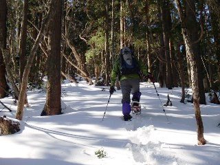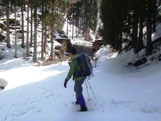実は23日の日曜日に、長女の出演する小さなコンサートがあり、小さなコンサートと言えど美容院やリハの送迎等をさせられることになるだろうから、山行は無理だと思い、21日の祝日に荒天候にも関わらず、JOEさんと今回のルートにアタックしたのでありました。 既に花折峠付近から雪となり、367号線には除雪車も出動している。梅の木より久多方面の道は、除雪されておらず、スタッドレスタイヤの稲妻号と言えど、ところによってはお尻をふる。冷や汗ものでどうにか桑原橋までたどり着き、準備をして登山口から取り付いたものの、しいたけの栽培地から少し登ったところで、JOEさんのワカンに異常が発生、よく見ればワカンのベルトがバッサリ切れた状態。何とか応急処置で行きましょうと言われるJOEさんに、これは神様のお告げだときっぱり山行の断念をすすめる小てつ、その時にわかに風が強くなり、植林地の中というのに一瞬ほとんどホワイトアウト状態となる。それを見て二人共、稜線ではもっと強い風が吹いているだろうし、あがっても楽しくないでしょうねと早々に引き上げる決断をする。 そんな訳で金曜日は撤退したのだったが、一夜明け前日となり、当日の時間スケジュールを打ち合わせしていると、何と各所の送迎は彼氏がしてくれると言い、親父は本番だけ聞きに行けば良いとのこと。それなら去年のペースで歩ければ十分本番までには帰って来れるので、すぐにJOEさんに連絡をとれば、ワカンの修理もできていて、予定も無く大文字山くらいでお茶をにごしておこうと思っていたところだと言うことで、それならとリベンジに行きましょうとなった。いつもにまして長い前置きとなりましたが、なにせ三日がかりの話しのことでして・・。