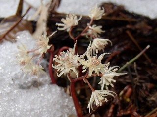 二日前とは違って道路にはもう雪はなく、快調に桑原橋までたどり着く。車はお堂の横に置かないで林道のゲート奥の空き地に置くようにと、土地の所有者と思われる方に以前言われたのだが、林道の空き地に置いておいても怪しげな感じなので、今の時期なら川べりに置いておけば釣り客と混同されて怪しくないだろうと、桑原橋の手前の川べりの空き地にデポして、準備をして8時30分に出発できた。 しいたけの栽培地から既に30cmほどの根雪の積雪があり、この先深くなる一方と思われることから、始めからワカンをつけて登ることにする。JOEさんのワカンは丈夫そうなひもで修理がされ、今日は大丈夫なようだ。 植林地を直登しP622までは一気の登りでしんどいところ、しかも今日は前々日降った新雪ラッセルということで、余計にしんどい。とにかくP622までと頑張って登る。標高600mくらいから、もう咲いていないだろうかと雪の無い根開き廻りや倒木の下あたりにバイカオウレンの花を探すが、見つけられない。