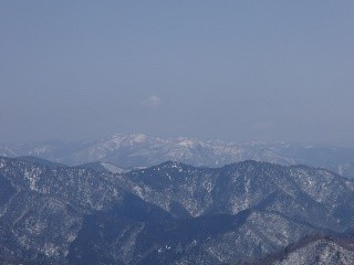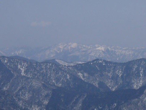 稜線の雪も、もう少し冷え込んでいればアイゼンで軽快に歩けるのだが、前々日の新雪と前日の気温のせいでか、ワカンでなければ歩けない感じ、気を抜くとはまり込む場所もある。雪に隠れた木の枝廻りなどがそうで、ワカンが引っかっかればややこしいことになる。 今日は前々日とうって変わっての好天で、朝一番よりも時間がたつにつれてモヤがとれ、まわりの山々の稜線がいつもより近く見える。北方のおにゅう峠から百里にかけての山の景色は、とても1000m足らずの山の景色には見えず、まるで北アルプスの山を見ているようだ。P885からは南向きの展望があり、北山の山並みを楽しむ、武奈や蓬莱山も見え出す。 P885を過ぎればなだらかな尾根歩きとなり、北の展望、南の展望と忙しいことだが、肉眼では素晴らしい景色でも、雪の上を歩いている関係で、丁度木々の梢が邪魔をして、カメラにおさめると、なんじゃこれの写真となる。