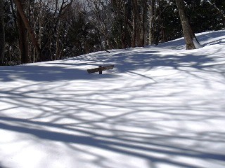 夏道通りに尾根伝いに進み、右手の谷が浅くなってくる頃にトラバースして、ふたつある鞍部の右手の鞍部に進むのだが、先行されるJOEさんは、もうこのコースを熟知されてきて、迷わずそちらに向かわれる。小てつはお茶屋跡の標識を探しに谷に降りてみるが、標識がかくれるくらいの積雪なので、まだ残雪は1.2mを超えているんだと思う。鞍部にある高島トレイルの標識も雪に埋もれていた。 鞍部には10時着で、夏より30分かかっていることになる。ここで、小てつが持ってきた○○入り紅茶とJOEさんの持ってこられたアルファートチョコで、冬場の定番のティータイムとする。糖分で速攻性のエネルギー補給をして、雪深い稜線歩きに挑むとする。
