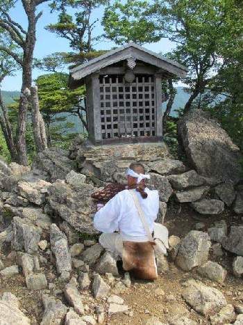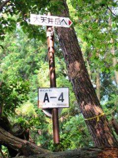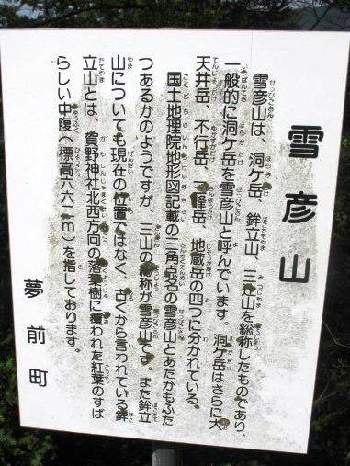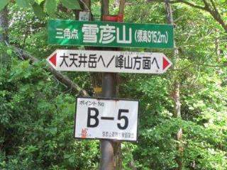 もう一つドジは、その直ぐ後の斜面をヨタヨタ登っていると、後ろの方に人の気配がします、見ると行者姿の男性が登ってこられます。ヨレヨレのオヤジはうっかりと浮石に足を掛け、こぶし大の石を落としてしまいました。 うろたえながらも、「ラク、ラク、落」と必死に叫びました。行者さんは落ち着いて「大丈夫です」と一言、何事も無かったようにオヤジを追い抜いて行かれました。いやーかっこええー、その後直ぐに頭の上でホラ貝がなり、「ハンニャハラ$#*+”!」と声が聞こえます。 大天井岳の山頂です、先ほどの行者さんが祠の前で祈っておられます。さて此処で雪彦山についてなんですが、とにかくややこしいのです、この大天井岳山頂は雪彦山の表示がありますが、国土地理院の三角点ではなく、後で行く三辻山と言われる山が雪彦山の三角点で、国土地理院ではそちらを雪彦山としています。その辺の説明をした案内板がありますので載せておきます。(ズボラなやっちゃ)