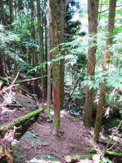 此処から尾根歩きから一転植林地帯を下ります、やがて沢沿いの道に出ますが、ほとんど最後までこの沢に沿って下ります。なかなか沢歩きとしては厳しい地点もあり滝もありで変化に富んで、それなりに楽しませてくれました、途中滝を撮っていたら、右の斜面から狸ちゃん特別出演もあり面白かったです。