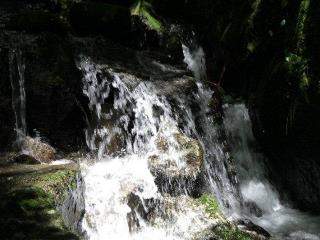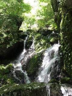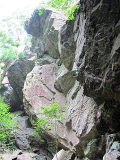 滝はいくつかありましたが、やはり案内がある虹ヶ滝とゆうのが一番大きく、それなりの迫力ですがナイアガラほどではありません。(当たり前や、第一お前ナイアガラの滝みたんかい)後で気がついたのですが、この虹ヶ滝の辺りから、裏登山道と呼ばれる分岐があるのでしょうが見落としました。 沢を下っている途中で若いアベックさん(古い表現やな〜)が追いついて来ました、最近は男女ペアーの山歩きがよく目に付きます、いや〜うらやましいなあ〜(年寄りがなにのぼせた事、ゆうてんのやー)そのアベックサさんの女性が「きゃーあんなとこに人がー」見上げると垂直の崖に人の姿が、地蔵岳かな〜例の分岐から裏登山道と呼ばれる所かなあ〜、それにしては強烈やな〜(あかんアカン、又変なムシおこして行こうと思てるやろ) それはともかく、若い二人についていくオヤジ(いやがらせかい)、時刻はボチボチ12時になるところですが、そのまま登山口のキャンプ場までがんばりました。