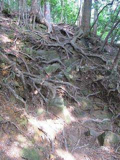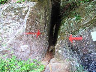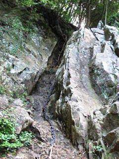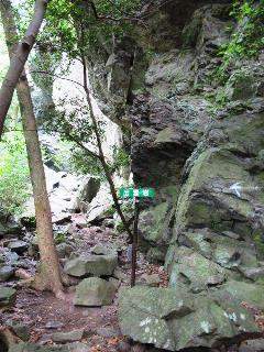 オヤジも一息入れたかったですが、気の弱いオヤジはそのまま先に進みます。相変わらず急な登りは続きますが、頭の上に巨岩がせり出す岩場、出雲岩と呼ばれる所に出ました。結果的には此処からが岩場の登攀のメインイベントみたいなもので、オヤジのようにヨレヨレストック頼みの人も仕舞ったほうが良いです。