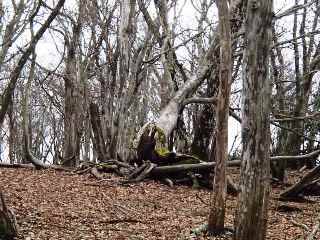 鯖街道の林道に近づく頃、林道を走っているのだろう3、4台のバイクのエンジン音がする。林道には10時30分に降り立つ、まだ早いのでそのまま対面の斜面に取り付く。ここからは、ほぼ踏み跡はない。 踏み跡はないが、反時計周りで木の葉っぱも無く、晴れていると一番高い822はよくわかるので、迷いようはない。迷わないということでは、反時計周りの方が、進路に迷いはないだろう。木の葉っぱがあるときはどうなんや?ということだが、木の葉っぱが生い茂る季節には、ここにはあまり立ち入る気にはならない。おそらくここら辺が、北山で今最もヤマビルの多いところだと思われるからだ。皆子山から大見、貴船あたりが一番多いんじゃないだろうか?。 お目当ての陸地谷が見える場所まで来て見てみるが、やはり状況は同じで、白いかたまりはあるものの、全山一斉ということではなかった。残念。今日はマメザクラディだ。 いったんP822まで登りお昼少し前、ラーメンタイムとする。ラーメンを炊き食していると、まだ寒いくらいなのに、やたらと羽虫が多い。シカの糞もたくさん落ちているし、やっぱり夏には来るところじゃなさそうだ。そそくさと退散する。 P822から北の尾根に進む。地形図のP706に行き着く尾根じゃなく、その西側の尾根に乗る。間の谷が蛇谷となる。 実は、ここに目印となるものがある。P822から北へ降り、いったん登り返して再び降る時に、一本のブナの木が、妙な角度で倒れている。枯れかかってはいるが、まだ生きているようだ。根元付近で幹に亀裂が入っていて、いかにも自然に倒れたように見えるが、そうじゃない。この木は熊が倒したのだ。