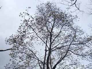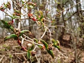 P771を過ぎ、もうぼちぼちタムシバが咲いていてもいいのだけど、そう目立たない。咲いている木もあるのだが、山一帯に白いかたまりがあるような感じじゃない。樹皮からタムシバと思える木を見つけ上を見上げると、なんとまだつぼみは固く小さいものもあり、陽当たりなのか何なのかいっせいに咲かないで時期がずれているようだ。 3年前だったか、ほとんどタムシバが咲かなかった年は、遅くまで寒くて一気に気温が上がり、花が咲く前に葉っぱが出てしまい、花が咲かなかったことがあった。今年はそれに近いんじゃないだろうか?その年は、その時期よりも遅くに咲く花は順調に咲いたので、このあとの時期の花に不安はないが、タムシバには受難の年になったみたい。ヤドリギも寒さのせいか、しなびたようになって元気がない。そんな中、マメザクラとダンコウバイは尾根の稜線でも花をつけている。 オヤジ殿が、ワンゲル道の登山道にある穴ボコのことを書いておられたが、ここ大見尾根にも大きな穴ボコが開いていて、尾根を歩いていると気づかないかもしれないが、P877のピークからほんの30mほど北側の東側にあるので、気をつけてください。かなり大きく深そうです。 広葉樹が落葉した後にここを歩くと、何本かは「熊だな」と思える木が目につくのだが、地蔵山同様に、今シーズンはほとんど無く、やはり去年の台風で木の実が落ちてしまったせいで、熊はごちそうにありつけなかったようだ。やっと鞍部にあったコナラだろうか風にあたらなかった一本に、それらしき跡を見つけた。