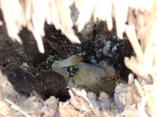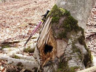 実は2011年にHさんとここを訪れた時に見つけたのだが、いきなりそのことを書いて、熊がウロウロしているところに物珍しさで大勢行かれても困るので、黙っていた次第。今になってと思われるかもしれないが、熊のことを理解していただくために、今回あえて書かせていただこうと思いました。 2011年、Hさんとおなじくタムシバの花見に訪れた時、妙なブナの木を見かけた。生えている角度が変だ。その木には幹の根元に野球のボールくらいの穴が開いている。穴を覗きこんでみると、何やら蜂の巣のかけらがあるではないか。穴の裏側の幹には、ギザギザと爪痕がある。となると・・、そうと解るまでに数秒もかからない。熊の仕業だ。ブナの木のウロに巣を作っていたミツバチの蜜を求めて、ブナの木を倒したのだ。 幹の中に巣が作れるくらいの、そう細くはない木を倒すほどのパワーだ。人間の力でどうこう言うものじゃない。また熊と遭遇した方ならわかると思うが、北山にいる熊はそんなに大きくはない、せいぜい1mくらいのものだ。熊だなを作っている木を見ればわかるように、高いところまで登っているから体重もそんなにないはずだ。それでこのパワー。絶対に逆らってはダメだ。とにかく驚かせないように、対処しなければならない。対処の方法は個々で考えていただきたいが、とにかくはなれたところで、向こうに気づいてもらうことだろう。