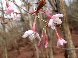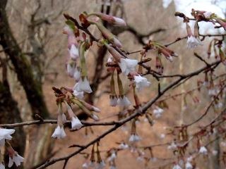 大見三叉路を左にとり、一軒だけ煙突から煙があがって人気のある民家を過ぎた林道分岐を右にとり、今日は小野谷峠へ向かう。この道は、おととしの豪雨と去年の台風の影響で、湿地帯が広がり、川岸がえぐられたところがあるので、ゴアテックスの靴でないとグチョグチョになります。そんな湿地帯の水溜りに、いつもの時期ならカエルが卵を産んでいるんだけれど、今年はまだ見当たらない。 湿地帯では鳥がよく鳴いていて、「鳥がよく鳴くときには、雨が降らない」というJOEさんと小てつの相言葉通り、今日は雨の心配はなさそうだ。ここで満開のキンキマメザクラを見つけ喜ぶ。ピンクのと白っぽいのとがあった。小野谷峠近くにまだ残雪が残る。