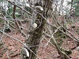 小野谷峠から大見尾根にのる時、取り付きは峠手前の尾根の先から入ると幾分傾斜も緩やかなのだが、今日のコースではっきり登りとなるのはここだけだろうと、峠から植林地の中の急傾斜を登って行く。一息70m登れば視界も開け、地図で見るよりもはっきりとした尾根で、テープなんか全くなくても不安なく歩けるところだ。 植林地がところどころあらわれるものの、ほとんどが雑木、とはいっても2次林もしくは伐り残しの林の中を歩くコースは、ガシガシ歩くコースではなく、のんびりと散策歩きを楽しむコースだろう。ここ大見尾根や対岸の雲取山あたりなどは似たような雰囲気の山。