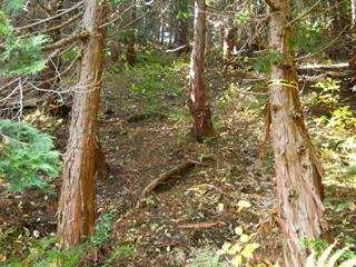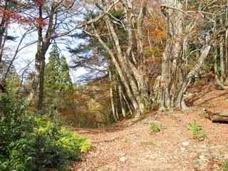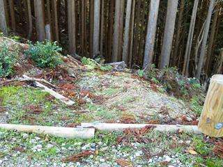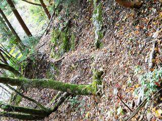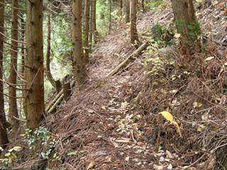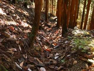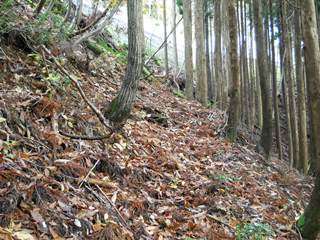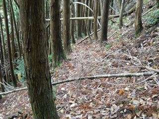 すぐに道はなくなる。 ただ丁寧に見ると踏み跡が発見される。 左にわずかに降り、そして右に折り返して進んでいく。 やや下がり気味に、しかしほぼ巻き道状に進み、それから何と、登っていく。 なぜ、と思う間もなく、古道に出る。 その古道は、かつては峠に直接登っていくと思われる形状だ。 思うに、基幹林道の造成に伴い、古道の最終部分が擁壁敷地となって消滅したため、代わりに不自然に作られた踏み跡という感じである。