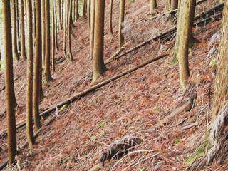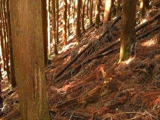 その後は植林の下の尾根筋を、ジグザグを切って道は登っていく。 地理院地図は谷に道が付いているが、そのすぐ西側の小尾根である。