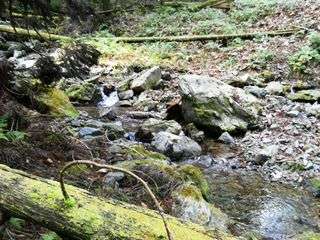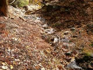 しかしその先で古道はわからなくなった。 かすかな踏み跡のままに西に進み、小尾根をわずかに降り、また西に山腹を降りていくと、谷底と渓流が見えてきた。 谷底の少し上を歩み、間もなく歩きにくくなったので谷底に降りた。 谷底はナメ状の岩もあり、下りは注意が必要だが歩ける。 渓流はきれいで、コウンド谷の最上部のような感じである。 ただ、増水時には使えないだろう。