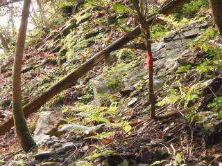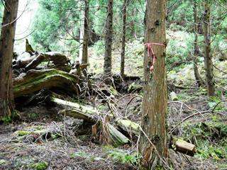 約30分進むと、左手に谷があり、ピンクテープを巻いた杉がある。 ここが衣懸坂の取付点である。 大きな流木のあるところで、標識はその陰なのでわかりにくい。