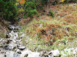 その先にテープを巻いた木があったが、そこが地図上の取付点であったのであろうか。 金久氏は、「以前は左谷に入ってからまもなく右の山腹に取り付いたが」「現在はもっと谷奥、400メートルくらい谷を遡ってから山腹に取り付く道に変わっている」と書かれている。 テープの地点が地理院地図の取付点としても、僕が降りた点は約300m上流であり、さらに上に金久氏が書く取付点があったのであろうか。