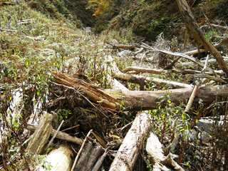しかしその先の谷底には流木が山積し、きわめて歩きにくい。 下りなら無理をしてでも進まなければならないが、登りならここで断念しそうな障害物であった。 その流木群を乗り越えると林道に出会う。 ホッとし、小休止をする。