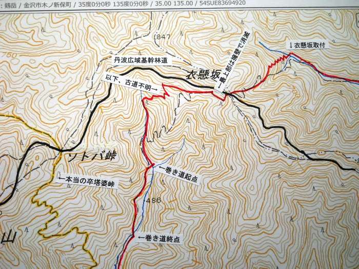 −谷合流、巻き道起点12:20−巻き道終点12:35−林道12:50−卒塔婆峠登り口13:00−卒塔婆峠13:55(以下略)