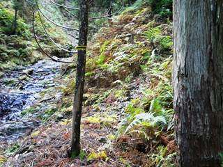 間もなく巻き道は終わり、谷に降りる。 赤白の四角標識とテープが目印にあった。