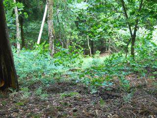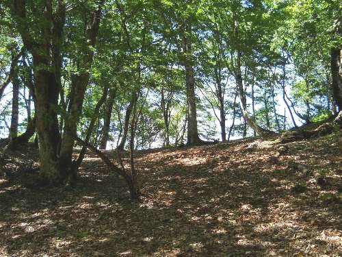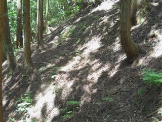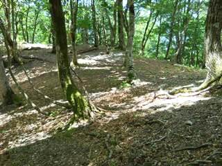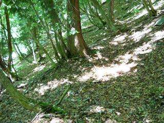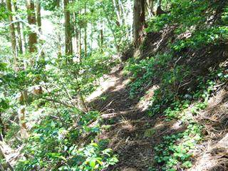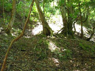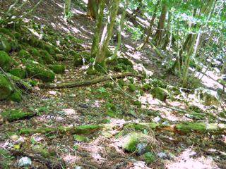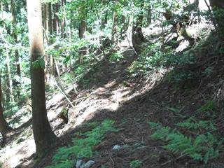 4回ジグザグを切り、H675mで方向転換したあとは、谷をまたいで左山腹をかなり進んでいく。H663m地点で方向転換する。再び谷を越え、今度は右山腹をゆったりとかなりの間進む。下に見える谷底は狭く、流れと岩と急傾斜のため道は造りにくく、そのため支尾根を利用した道が考えられたようだ。H625m地点で尾根を乗り越す。尾根の手前はかなり生え込みがあり、逆方向から来た時はわかりにくいだろう。
