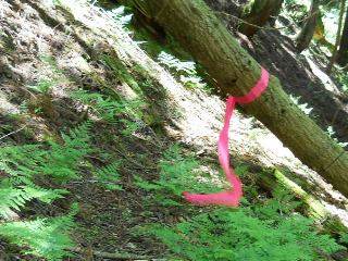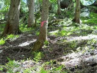 尾根を乗り越してH616mまで降りた地点で折り返す。再び尾根の鼻先、H600m地点で岩にぶち当たるので折り返す。わずかに下がった地点で、かなり踏まれた水平道に降り立つ。これは植林管理道のようで東の谷沿いに道はつけられている。逆方向から来たとき、この取り付き点がわからないだろう。倒木のピンクテープのすぐ横が折返点である。