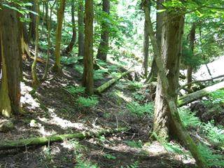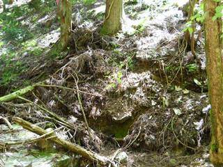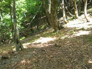 水平道を西にわずかに進むと、支尾根の鼻先となり、行き止まりとなるので、下に見える谷川に降りる。道はなく、歩ける所を進むと、降りてきた谷との合流点となる。下から見ると、谷沿いは傾斜と岩と流れで遡行しにくい。やはり支尾根を使った峠道が必要である。