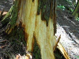 ここから本来の品谷の川沿いの道が始まる。釜ヶ原まで下ってみたい気持ちが強いが、谷は荒れ、道はわからない。時間的にも限界であり、再び来た道を帰った。 昨夜の作業だろうか、生々しい熊の皮剥の跡が随所にあった。鈴を忘れた僕は、大声で歌いながら探索をした。