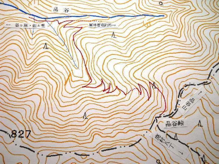 品谷峠は、金久氏が書かれているとおり、「平坦で気分の良い疎林になっており、風光的に優れた詩情は群を抜く。」峠の中央よりやや東に立ち、品谷側をのぞき込むと、右側の山腹をカールして降りていくかすかな踏み跡が発見できる。山腹を利用して少しずつ高度を下げる作道である。