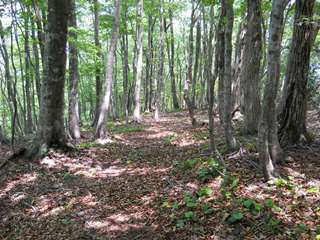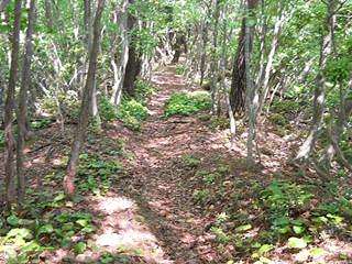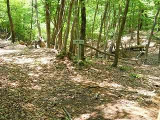 ものの30分も登ると、稜線に近くなる。道は稜線の西側のやや下を、緩やかに登っていき、やがて稜線を歩くようになる。ほぼ平坦な稜線はとても快適で、傾斜がある所だけジグザグに登っていく。P645の先で左手から作業道が合流し、今歩いてきた方角に「山森区へ」とプレートが立っている。 そのわずか先に、再び左手から作業道が合流してくる。ここには、「林道へ」とのプレートがある。この道は関電巡視路を兼ねているようで、たどれば谷沿いの林道に出て、最初の登り口のところに出る。頭巾山への登山にはこのルートがよく使われているようだ。