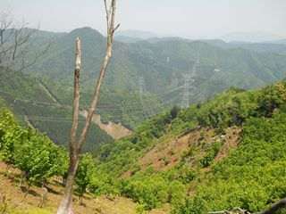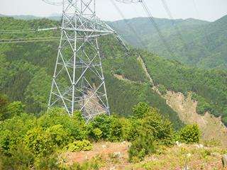 しばらく歩くと小ピークがあり、道は左腹を巻いている。そこは伐採された裸地になっており、下には大きな送電鉄塔が建っている。通常はここから下に、送電巡視路を使って降りていく。 今回のテーマは、ここから先の古道探しなので、道はないが小ピークを巻いて東北方向の稜線に乗り、進んでいく。尾根は下生えがなく、歩きやすい。よく見ると、曲がりくねった古道の跡がかすかに発見できる。倒木や枯れ枝が堆っており、そのままは歩きにくいので、歩きやすいところを選んで下っていく。