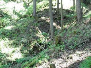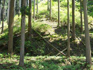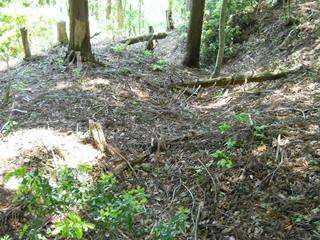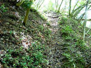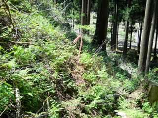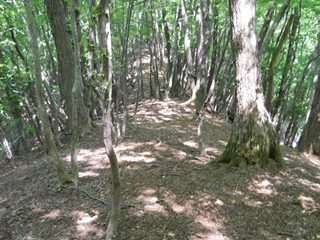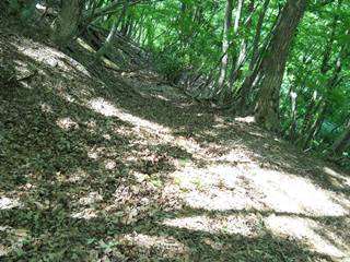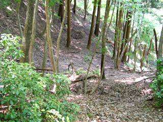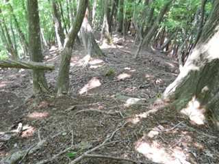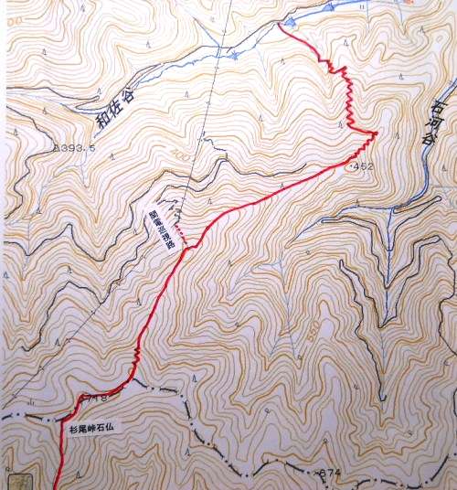 452mピークまで来ると、わかりにくいが、踏み跡はピークの左側を巻いていく。そして東北方向の尾根を下っていく。その尾根はやや急なので、ジグザグに切られた古道がはっきりする。400mまで下り、尾根が平坦になる少し手前で、古道は左斜め下に方向を変える。山腹を巻くようにして、一つ西の尾根まで進む。