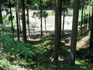 最後の部分は、逆に歩むとわかりにくい。中野集落から二つめの堰堤の砂の中に降り、南から流れ込む小さな谷の左岸の10mほど上に、ピンクテープが見えるので、そこまでよじ登り、あとは見える距離でピンクテープが続くので追う。谷川を渡り、その尾根を登っていくと、左上方に導く古道が発見されるだろう。草の多い時期はこの部分、難しいかもしれない。(以下は、逆方向から見た写真)。