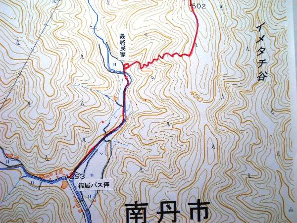 横尾峠は、美山町福居山森と福井県おおい町納田終中野とを結ぶ地域間交流の古道である。頭巾山への登山路として古来、使われている。美山町側の峠道は金久氏も絶賛されるような古道が残っているが、おおい町側は和佐谷林道と関電巡視路が一般的に使われることもあり、古道は歩かれた記録がない。どうなっているのかと訪ねて、古道が発見できた。 JR日吉駅に下車、南丹市営バスとデマンドタクシーを乗り継ぎ、福居で下車する。上谷を遡り、橋を渡ると最後の家屋がある。ここが登り口である。標識に導かれ、家の横を通り、右手の小さな谷に入る。