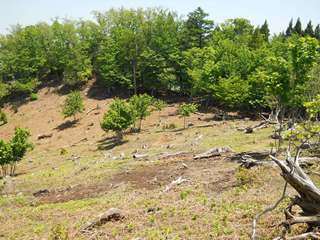その後、尾根つたいに進む。北側は伐採された跡で地肌がきれいだ。その先に小ピークがあり、国境尾根の屈曲点がある。古いプレートもある。小ピークの右腹を巻いて進み、急な下りを黒いプラ階段を使って降りる。降りた所からは歩きやすい道が始まる。