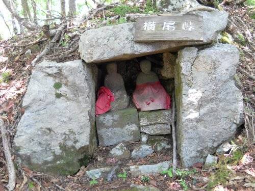 その先を詰めると若丹国境稜線のピークにたどり着く。そこは国境の縦走路とT字型に合流する点で、石室と2体の石仏がある。頭巾山信仰の厚さを物語っている。 そこから右手にわずかに進み、718mピークに立つ。西以外の方位が展望できる抜群の地である。双耳峰の青葉山、遠く百里ヶ岳、八ヶ峰などの国境の山々、その先に芦生の山々、南には白尾山などの美山の山々、遠く大岩山のでこぼこ峰まで、パノラマ展望である。