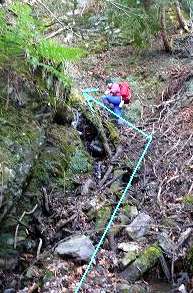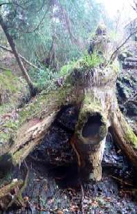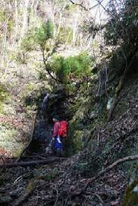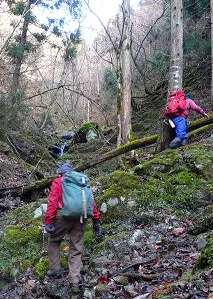 新名『ワサビ谷』の沢は、通る人もないので、苔がびっしり岩に張り付いている。おまけに、「ここらの岩は滑りやすい」というだけあって、ヘタに足を乗せようものならばつるりんと転んでしまう。藪枯れで見通しが利くので、慎重に足場を探しながら前進。現れた小滝群の左岸を巻いて、慎重によじ登る。「ゆっくりでいいで。あわてんでいいからな」とOさん。小てつさんがロープを出してくれるけど、「いらないよ、平気だよ」とすべる岩場をよじ登るわたし。が、ずるっと足を滑らせて、危うく墜落しそうになるわたし。「だからぁ ロープ出したのに・・」と小てつさん。すみませんデシタァ。 第1の難所を通過すると、倒木が散乱した荒れようになり、すぐに沢の分岐。ここはポイントで、左側 西の沢へと進むべし。巨大な倒木が転がっている。すっかり苔に覆われいる。どの木が折れたのか、上を見上げると、斜面にこれまた大きな木の根元が残っていました。相当な巨木だったことでしょう。 沢の西側の尾根を見上げると、等高線上に道型らしきものの痕跡がずっと繋がっています。 「古道は等高線で大滝まで登っていっているなあ」とOさんと小てつさん。沢沿いに歩かず、尾根の中腹を行く巻き道だったようです。