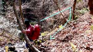 大滝の西の斜面には、谷の入り口から等高線で続いていたであろう巻き道の、名残があった。炭や薪を背負って歩くには、安全で早く歩ける道が必要だ。ところで、炭1俵、何キロと思いますか。20キロだそうです。それではますますのこと、足場がしっかりした道じゃないと駄目ですよね。 大滝の上部をこわごわトラバースして、垂れ下がった藤蔓にしがみついて、滝の上の沢に到着。見上げると、頭の上はもうノッコシの鞍部で、葉の落ちた大木の上には真っ青な空が広がっている。朝は凍結していたけれど、陽が上るにしたがって気温がぐんぐん上がり、暮れとは思えぬぽかぽか陽気。ここらで一休みしようか、お湯を沸かして、小てつさん持参のこぶ茶をよばれた。