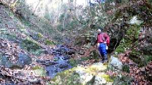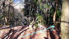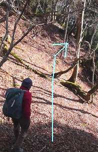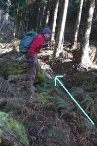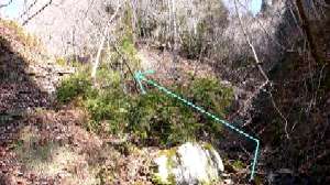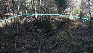 ネジリキ谷からホラノ谷の林道付近、「イコモッチャン、どこが入り口かわかるか?」林道から北側の斜面を透かしてみると、植林地の中を走る1本の道。林道から一段高くなった場所にある。わたしは作業道かな?と思っていた踏み跡だが、「これがな ノッコシへの入り口やで」 さらに、林道を少し進むと、草ぼうぼうの沢の入り口がある。以前、この草むらをかき分けて谷に迷い込んだ場所だ。今日もOさんは、枯れた草を踏み沢に進む。「さっきの道はあそこに見えるやろ。」ノッコシへの取り付が右側に見えている。「そしてな、ここ。ここがもっと以前の入り口や」Oさんが指差す方を見れば、草に覆われてはいるものの、深く掘り状にえぐれた道型がくっきりと残っているのです。「これだけ掘れているってことは、相当人の行き来があったってことですよね」嬉しくなってしまうなあ。
