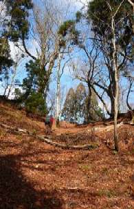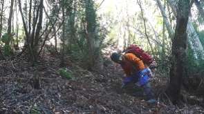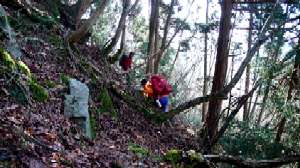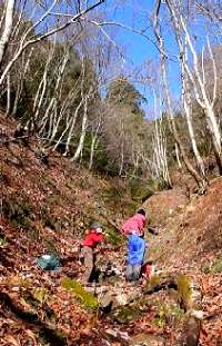 少しの間はっきりとした道があるので、進む。西側の首吊り尾根。ここで事件があったそうで、怖い名前の命名はOさん。「この尾根はな、昔は道がなかったんや。いっぺん行ってみよかって庄兵衛のだんなと登ってな、これなら使えるなあと枝を切り開いて道を作ったんや」そうやったんですか。「尾根の取り付きは、あんたらが使こうている作業道やのうて、林道からまっすぐに直登するんやで」えーっ それってかなりな激登りですやん! そんな苦労話を聞きながら、沢沿いの道を進む。分岐を右へ行くと、すぐに道は怪しくなる。右岸を見ながら、「あっちに道型が見えるなあ」とOさん。沢伝いに道型が残っているので見にいくものの、先は流れていて見分けがつかなくなる。「あの上のほうに、道があるみたいやけど」と小てつさん。下から斜面を眺めると、確かに道らしきものが水平に走っている。西の斜面をよじ登るが、獣道が続くだけ。さらに上の方へと偵察に行くOさん。 「あかんわ、もう道は消滅しているなあ」獣道が辿れたら行きたいところだが、それも崩れた箇所が多く、無理っぽい。沢沿いに遡ったほうが安全だろうということになり、3人で沢を遡ることにした。