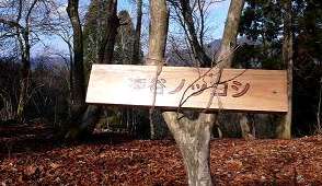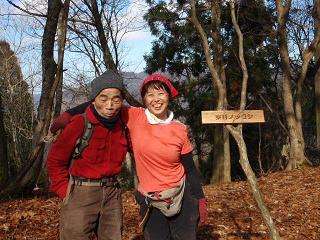 元気が出たところで、もう一仕事。最後の源頭部を上り詰めると、もうひとつのポイント、沢の分岐がある。ここも左側西の沢に入る。すぐにゆるい登りになる。堆積した赤や茶色の落ち葉をさくさく踏み分けると、そこはノッコシ。Oさんが、この木につけたらいいんと違う?」と鞍部の中心にある小木を指差す。先日の『かもんこえ』標識は木にぐるぐる巻きでくくりつけたのでちょっと駄目だったかなあ 、今度のには穴を開けてきた。紐を穴に通し、無事、『東谷ノッコシ』の標識を掛けた。と、Oさん「あんな ほんまは赤崎東谷ノッコシや」と言い出した。あー、正確にはそうやなあ。でもま、今回はとりあえずってことで、目をつぶってもらいましょう。次回、『赤崎』を書き加えにまた参ります。