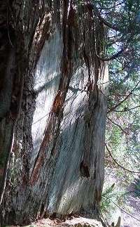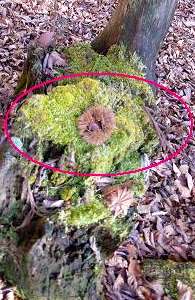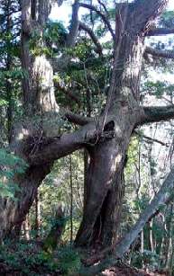 しかし、このサエ谷の尾根もいい加減藪こぎが続きます。はっきりした道がないので、獣道を歩きます。藪を巻き、潅木を掻き分け下ります。先頭を歩いていたわたしは、いつの間にかOさんに追い越されてしまいました。Oさんは歩きやすい道を探すのが早いし、すたすた歩くのです。さすがです。 この尾根で、不思議な巨木を発見。門の形をした2本の大木。なぜ門かというと、左の木の枝が伸びていった先に右の大木の幹があり、そのまま枝を伸ばしたもののいつの間にやら右の木の幹に巻き込まれてしまったというのです。延びた枝先は枯れていますが、太いので、かなりの年月をかけてじわじわと取りこまれたようです。想像するだに恐ろしい光景に思えます。右の木の枝は真綿をくるむように締め付けられていったのでしょう。左の幹からは樹皮というか細胞というか なにやら得体のしれぬものがじわっと伸びていったのでしょうね。 「あっ りすのレストランや」と小てつさん。見ると、木の切り株の上に栗のイガがちょこんと乗っています。「???」リスが栗の実を食べた跡だそうです。見晴らしが利く木の切り株の上に栗の実を持ってきて、ゆっくりご馳走になるんだとか。「あるとき、ひょいと見るとりすが夢中になって実を食べていてなあ・・・」とOさん。そうか、わたしはまた上手に木の切り株の上に栗の実が落下したもんだなって、思ってましたよ。これから山を歩くときは、レストラン探してみよう。それから気をつけていると、2個3個とイガがのっかった切り株がありました。たのしいなあ。