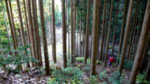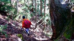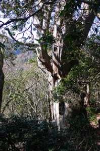 道端の大木の一部が、すっぱりとありません。90×100センチはあるでしょうか。「これは板取りの跡や」とOさん。のこぎりで切り取れるだけの、大きな一枚板を切った跡だそうです。天井板とかに使ったそうです。「一升飯をかきこんで山に登ってきて、一日がかりで板を切り出して、背中に背負って下ったんや。大変な力仕事やったろうな」と、Oさんの話を聞くと、まるでそこにわたしもいるような気持ちになります。こんなに大きな板を切断しても、木の本体は死なないそうです。それもすごいことです。 怪しくなった古道は、かすかに獣が歩き続けているようで、谷の上部をトラバースしながら道が見える。辿っていくが、これが怖いのなんの。下は谷の源頭部に急斜面が下っていて、崩れそうな土の上を滑り落ちないようにへっぴり腰で一歩一歩。そんな私を尻目に、Oさんはすたすたと進み、藪を分け道を探している。トラバース道でも身体は立っているもんね、Oさん。わたしはやっちゃあいけないという山側にへばりついた姿勢です。こわーい。 そうやって源頭を2つ巻き、やっとサエ谷尾根本体の真下に近づきました。最後、苔むした大岩群を乗越えて、やっと尾根上に到着。あーやれやれです。