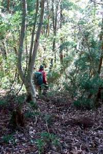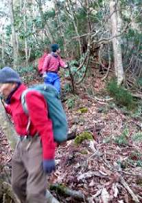 標識と記念撮影後、昼食。 ノッコシの東谷側には、道型が残っている。じぐざぐに尾根を下ると、東谷沿いにゆるい巻き道が由良川へと続くそうな。東谷には、炭焼きの基地があったそうだ。つい数十年前まで、わたしが子どもの頃までは、家庭では炭や薪が熱源であった。床下には、炭置き場があった。街中でもかまどがあったし、風呂は薪で沸かし、炭をおこして調理もしたし、暖もとった。薪炭産業は一大産業であった。広河原には炭の集荷場があったという。活気ある村だったことだろう。 「さあて、これからどう行くかな」とOさん。もちろん「ノッコシからサエ谷尾根に続く古道を探しましょうよ」とわたし。ノッコシの南面を東へと、うっすらと道型が残っている。ちなみに、西面には今日登ってきた谷へと下る道型が、残っていました。見にいったけれど、先は消滅。 谷を巻きながら道型は東へ続く。が、すぐに倒木が道をふさぎ、その先は怪しくなった。「こうやって倒木が道をふさぐと、獣が通れませんやろ。獣が歩かんようになると、道はだんんだんのうなってしまいますんや」そういうことですか。先日見つけた古道は、人が使っているから残っているわけではないのですね。獣が歩いているからきれいに残っているわけですね。あの古道は倒木がなかったですもんね。古道を残すには、時々見回りにきて倒木をどけてやらなくちゃいけないのですね。