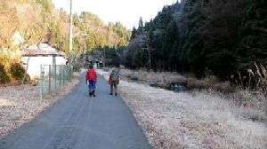 ノッコシの標識を取り付けに行くべく準備していたら、小てつさんが同行してあげましょうと嬉しいお誘い。小てつさんの愛車軽トラに乗せてもらい、花背峠を越える。 今日もやっぱり、峠を越えたらがらりと景色が変わり、別所村は一面の霜の世界。光る路面に、小てつさんの運転も慎重になる。先の14日、小てつさんは、10年ぶりに歩くというOさんと一緒にノッコシ古道を探査したばかりのほやほやで、わたしも同じ道を連れていってもらう約束だ。Oさんは仕事で来れない・・の言葉に、少々がっかりだ。ノッコシには是非ともOさんに案内してもらいたかったのだが・・・。 お約束の庄兵衛さんの前に、1台の軽トラ。「あれえ Oさんの車やん?」お店の椅子にちょこんと座っていたのは、Oさん。「あれ 仕事じゃなかったの?」なーんと、どっきりカメラならぬ、びっくりサンタ小てつさんのクリスマスプレゼントだったのです。山に行くというOさんを、誘ってくださったってわけでした。嬉しさに舞い上がるわたし。 Oさん、小てつさん、絶妙な組み合わせの師弟コンビ。小てつさんはついに長年愛用の腰ベルトを止めて、師匠から譲り受けた大きなザックを担いでいる。一切合財を詰めたら重いのなんのと言いながら、軽い歩調のOさんにしっかり着いていくところなぞ、なかなか頼もしい限り。Oさん、いい弟子ができて心強いことでしょう。