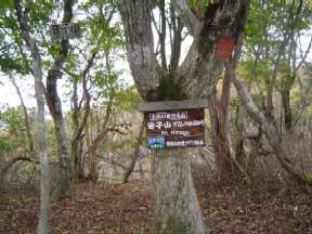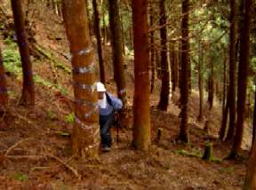 寺谷出合の丸太橋を渡ります。久しぶりに同行者と登ることになり,ゆとりを持って登っていきます。廃小屋の横を通り,さびた表示板のある谷合流では右へ上っていきます。早めに小休止に入り,暖かいので二人とも服装の調整を行ないます。次の谷合流も右に取り,谷に沿った杉林の道を行きます。やがて大岩が現れ,だんだん谷も細くなり険しくなってきます。急斜面にロープがつけてある箇所を登りきると,その後はスギ林の急坂を折り返しながら上がっていきます。この頃になると同行者のスピードが落ちてきていることが判ります。待ちながら登っていきます。山頂近くになると一人で登っていくので先に行ってくださいと言われる。ルート説明して一旦先に谷を上りきるが,やはり心配で結局一緒に山頂に立ちました。