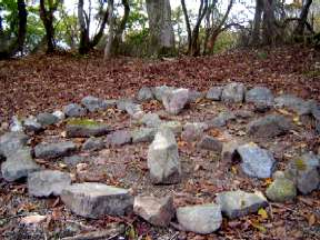 山頂はだれもおらず静かです,風もなく曇っているものの視界もまずまず。男性が地図を出し周囲の山を確認します。二人で比良山系を北から見てとんがっている武奈ヶ岳,そのまま南へ尾根を見て近くには蓬莱山を同定していきます。残念ながら峰床山は真北にあるのですが雑木林で見えません。山頂広場にはいつの間にか,小石でストーンサークルが作られており中央にはコンパスがおいてあります。早めの昼食を摂っていると,男性が一人,しばらくして息を切らした男女が登ってきた,3人のグループのようだ。小休憩すると寺谷へ下って行きました。同行してきた男性と下りについて確認すると,バイクが寺谷に置いてあること,このままツボクリ谷を行くと迷惑をかけて悪いので,今回は寺谷を下って帰ることに決められ,山頂で別れることにした。